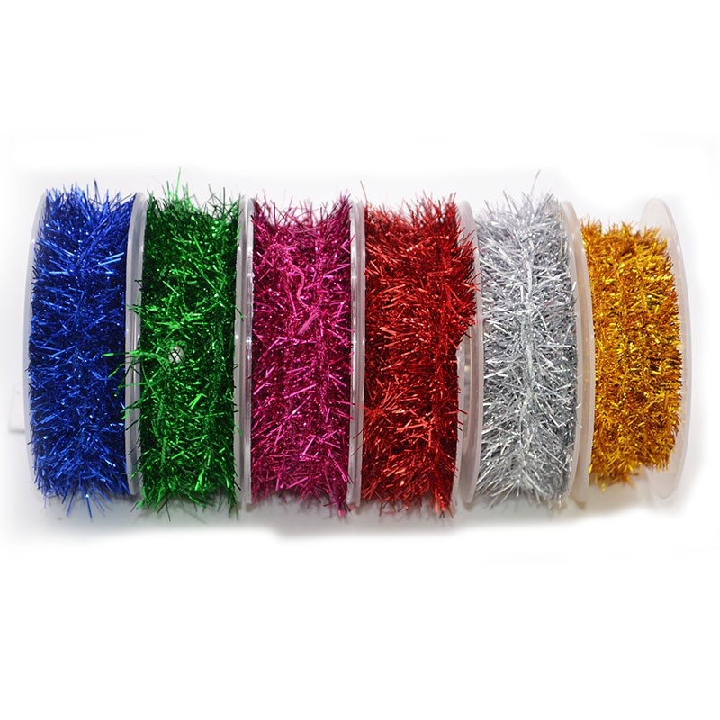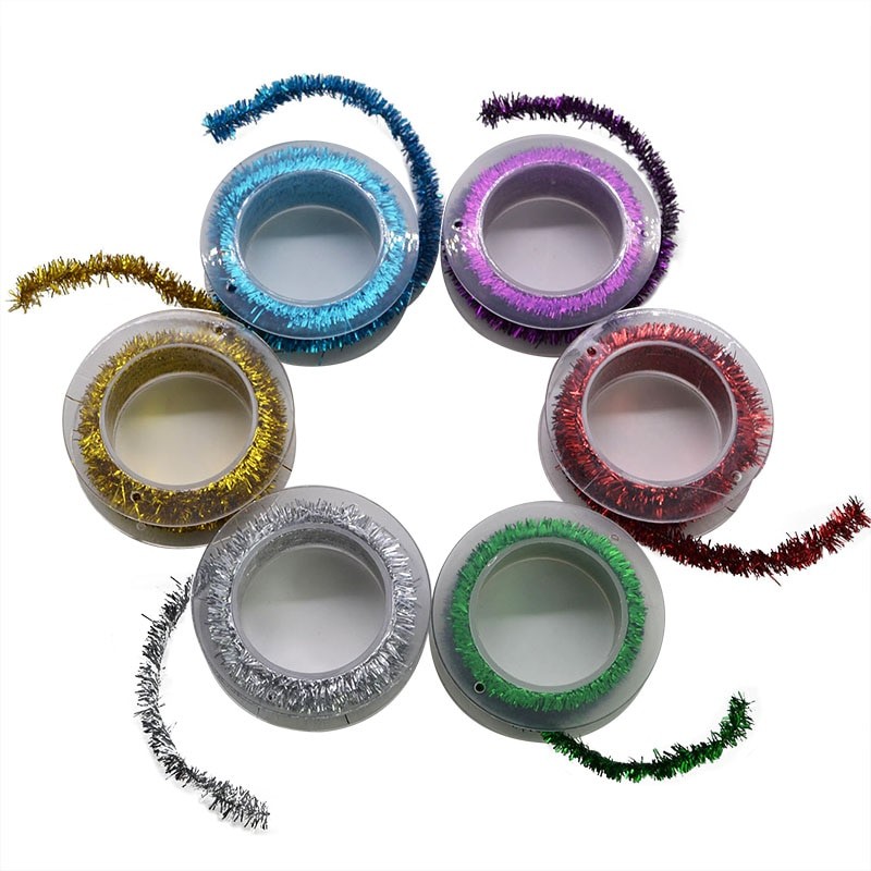 Cadeia decorativa cintilante em cores metálicas sobre um fio fino.
