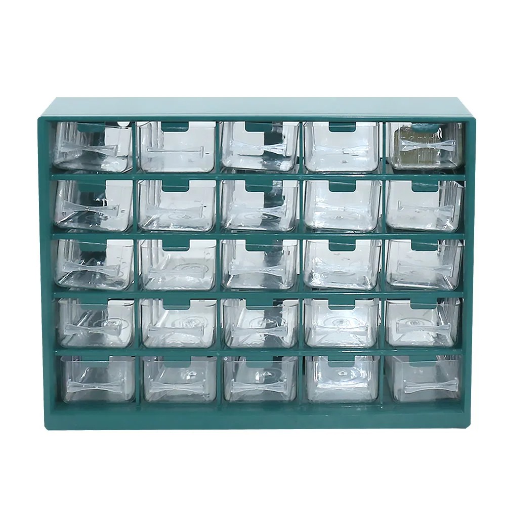 Organizador de plástico com 25 gavetas para parafusos, pregos e pequenos componentes. Estrutura resistente, design compacto e organização eficiente da oficina. Dimensões da gaveta: 11,3 x 5,1 x 3,3 cm Descrição completa
