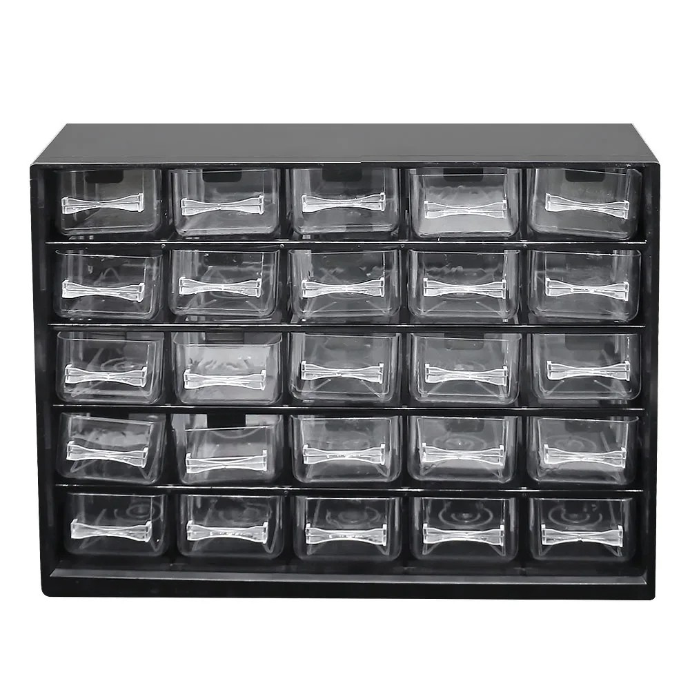 Mantenha as suas ferramentas, parafusos e pequenos componentes organizados com a caixa de armazenamento multifuncional em plástico. Este organizador prático com 25 gavetas oferece espaço suficiente para uma organização eficiente e acesso rápido a todos os itens armazenados. A estrutura de plástico resistente garante uma longa durabilidade, enquanto as dimensões compactas permitem fácil colocação na mesa de trabalho, prateleira ou armário. As gavetas são facilmente deslizáveis e transparentes, permitindo uma verificação imediata do conteúdo sem a necessidade de abrir cada uma individualmente. Ideal para oficinas, garagens, bricolage em casa e uso profissional.