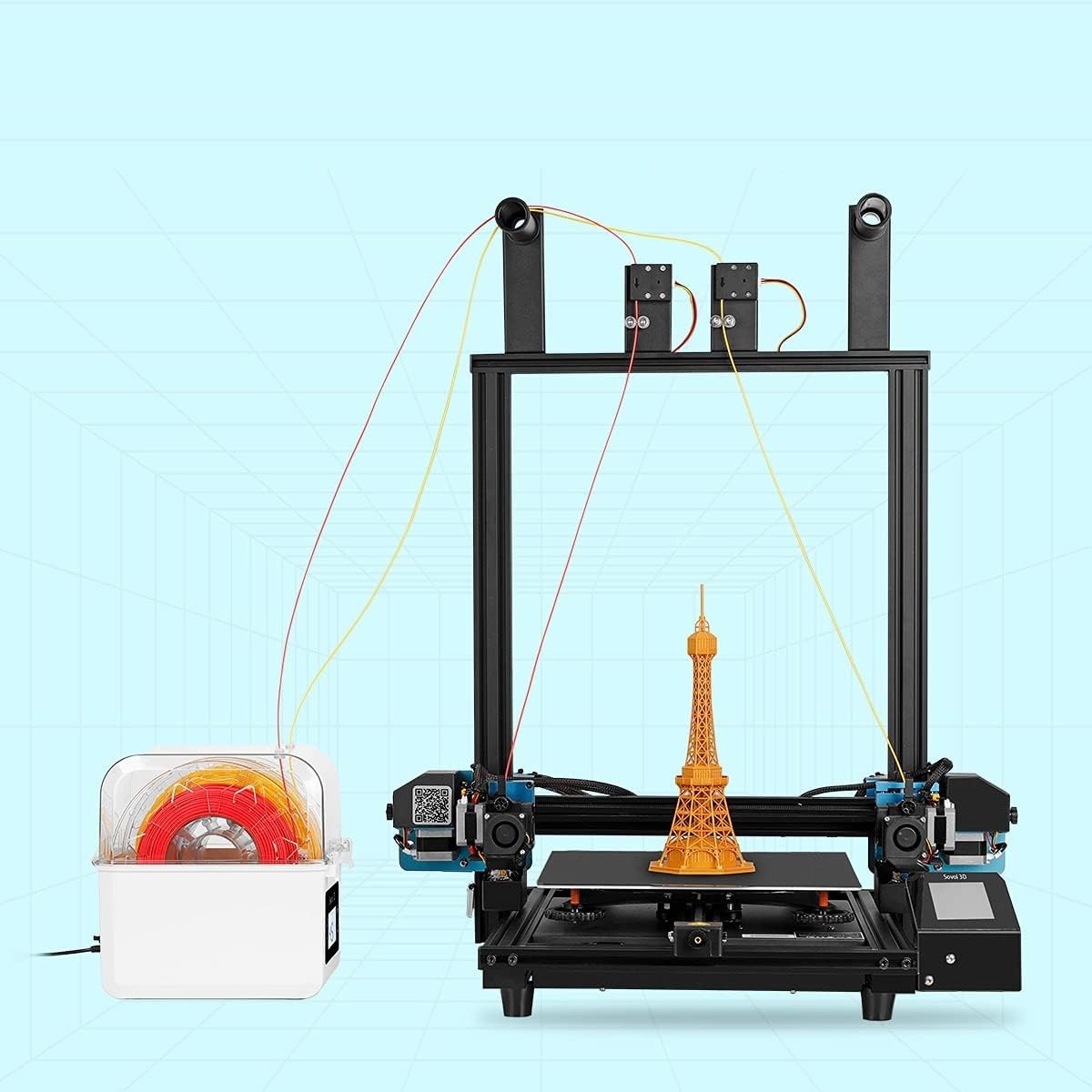 O dispositivo comporta duas bobinas com largura até 70 mm, ou uma bobina com largura até 150 mm. O diâmetro máximo da bobina é 210 mm. No geral, a caixa é dimensionada para fácil manuseio, confortável passagem do filamento pelo tubo guia e um desenrolar suave (colocação das bobinas em rolamentos dentro da caixa). A construção interior utiliza rolamentos na parte inferior, que garantem uma rotação estável e suave das bobinas.