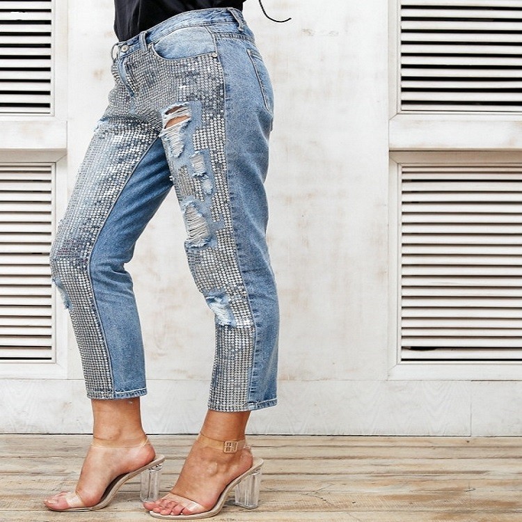 Calças de ganga rasgadas com lantejoulas