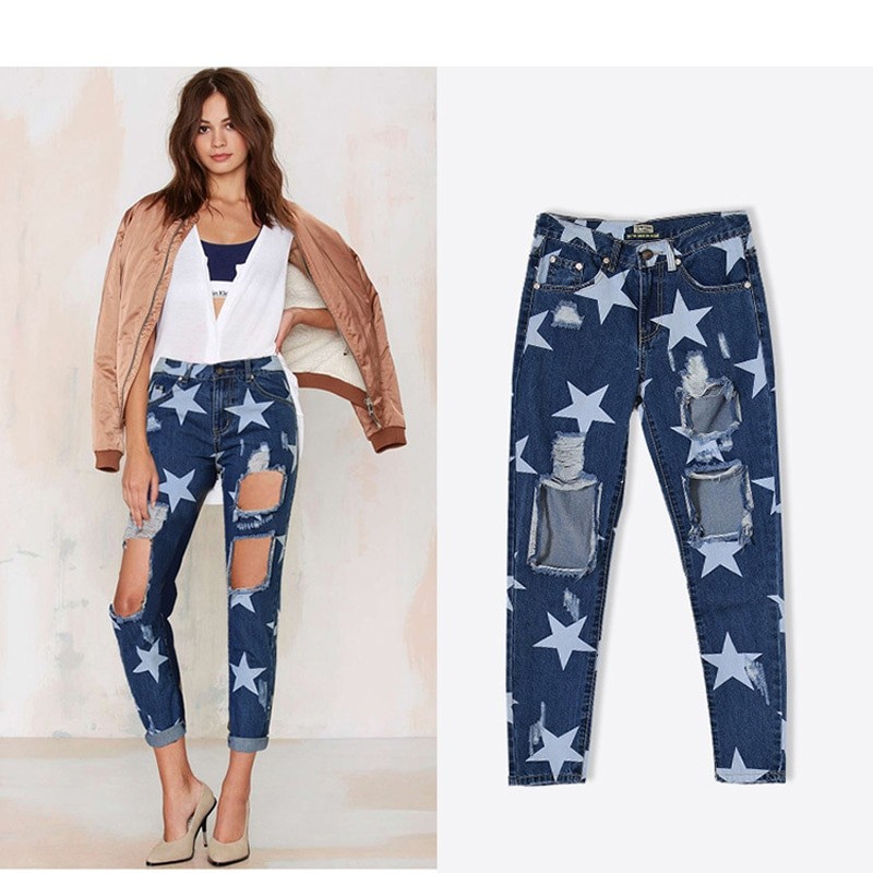 Página inicial Página inicial Roupa e acessórios Roupa de mulher Jeans de mulher Calças de ganga rasgadas para mulheres com estrelas