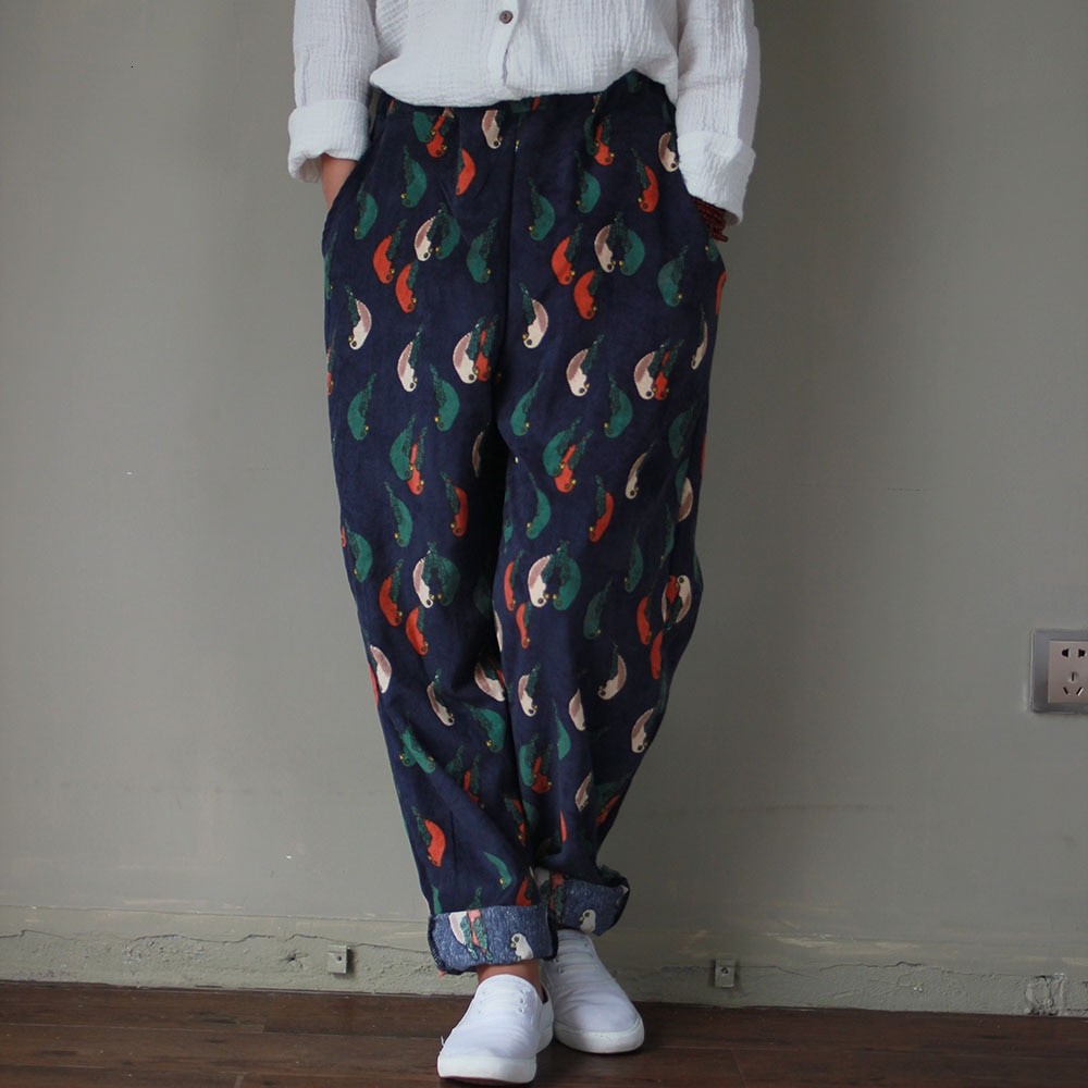 Página inicial Página inicial Roupa e acessórios Roupa de mulher Calças de mulher Calças femininas com padrão de pássaros