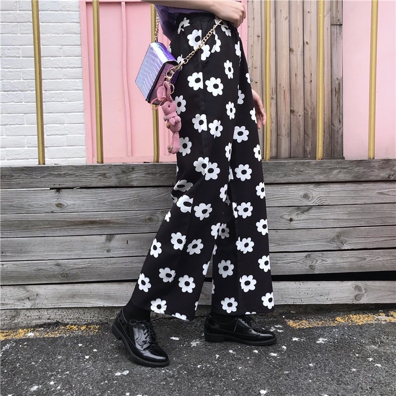Calças pretas e brancas para mulher com flores