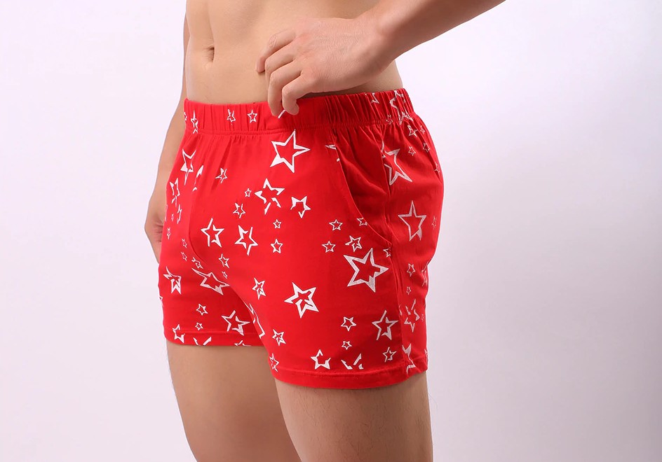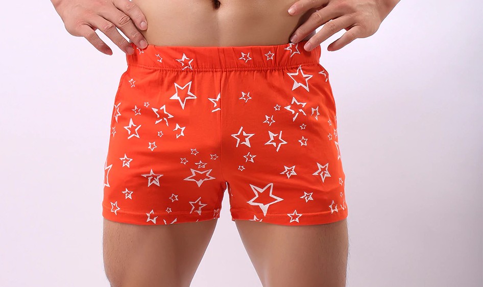 Os calções têm um padrão de estrelas. Uma escolha ideal para a praia ou para passeios de verão.