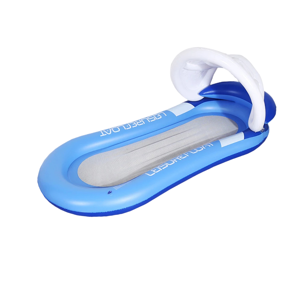 Cama de ar azul com rede integrada e toldo para máximo conforto na água. Descrição completa