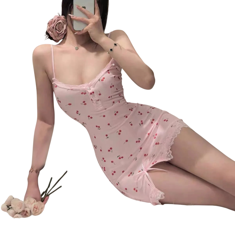 Camisa de noite feminina estilosa com delicado padrão de cerejas, com bainha de renda, decote em V e fenda para máximo conforto e charme feminino. Descrição completa