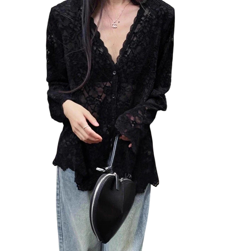 Camisa de Renda Elegante para Senhora com Mangas Compridas Blusa Transparente com Decote em V e Fecho de Botões Top Liso em Poliéster