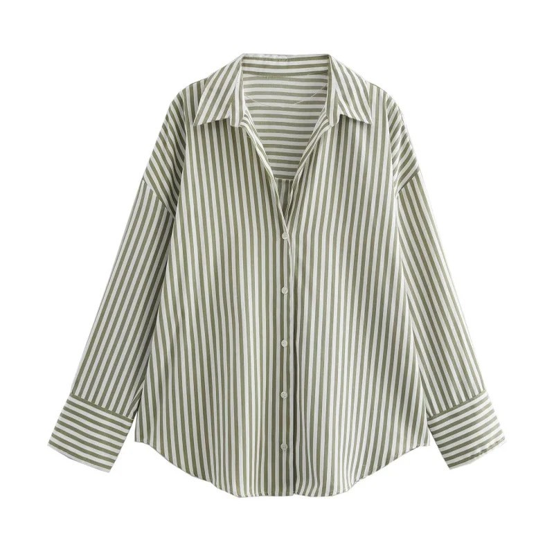 Página inicial Página inicial Roupa e acessórios Roupa de mulher Camisas de mulher Camisas casuais de mulher Camisa feminina riscada de corte solto com mangas longas e colarinho