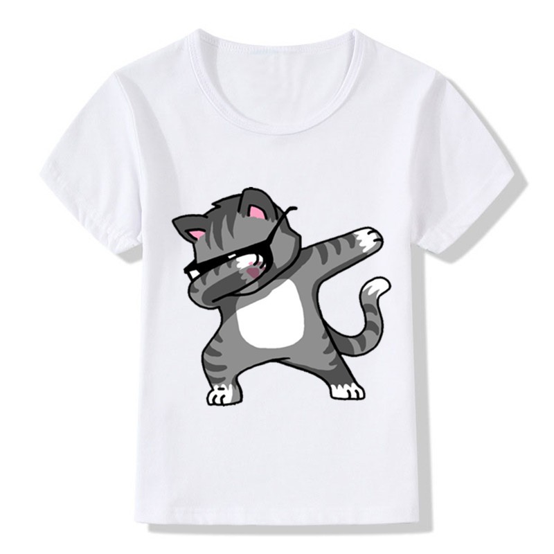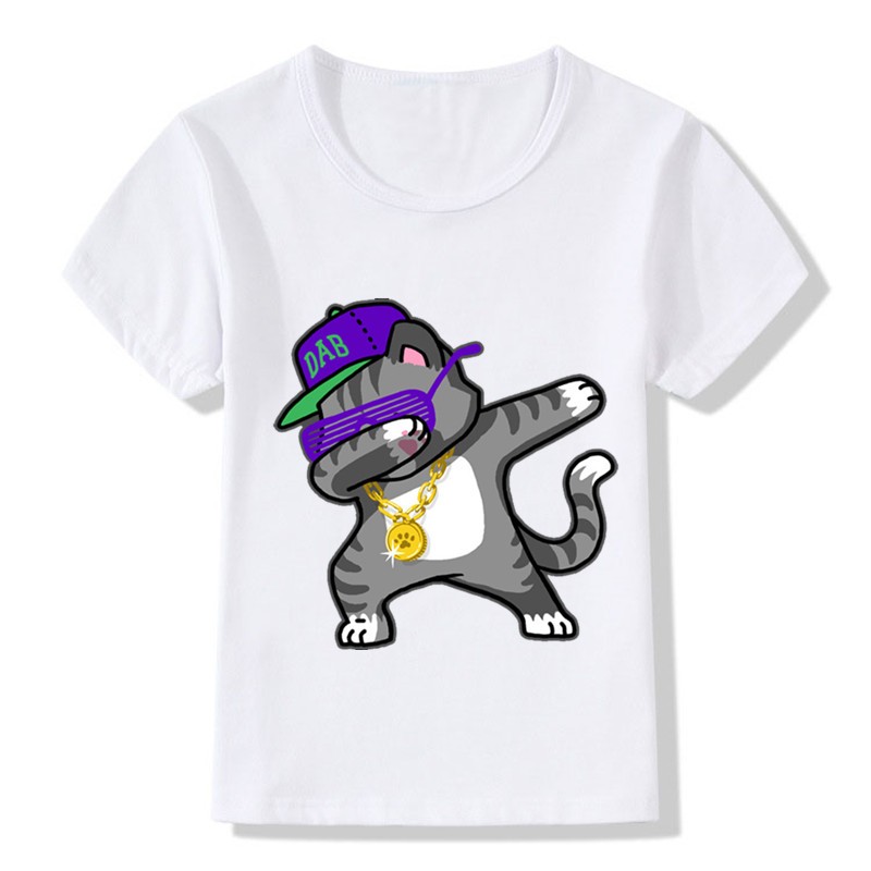 Esta bonita camiseta de rapaz ilustra gatos a fazer dab, uma dança que está agora muito na moda.