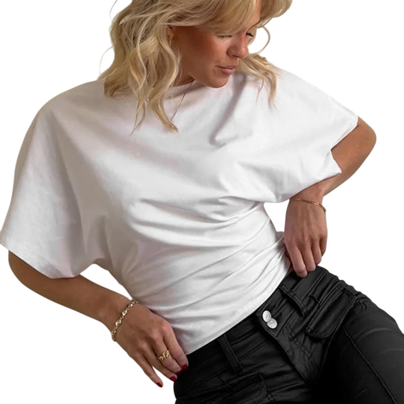 Camiseta estilosa com corte mais solto, manga curta e comprimento até à cintura. Combina perfeitamente com jeans e saias, garantindo conforto durante todo o dia. Descrição completa