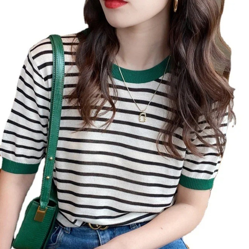 Página inicial Página inicial Roupa e acessórios Roupa de mulher T-shirts e tops de mulher T-shirts e tops de manga curta de mulher Camiseta riscada de mulher com mangas curtas Suéter elegante com decote redondo Top de moda para lazer na cidade e no escritório