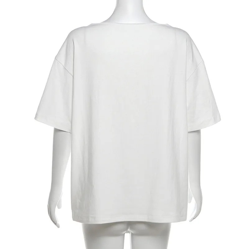 Página inicial Página inicial Roupa e acessórios Roupa de mulher T-shirts e tops de mulher T-shirts e tops de manga curta de mulher Camiseta solta com estampado para o tempo livre Corte oversized Decote caído Material de algodão Estilo streetwear Conjunto para a cidade