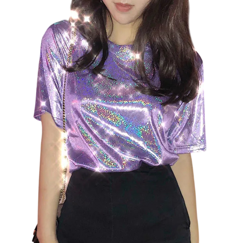 Camisola brilhante de senhora com mangas curtas Corte solto Top brilhante com decote redondo Camisola da moda para festas e uso diário