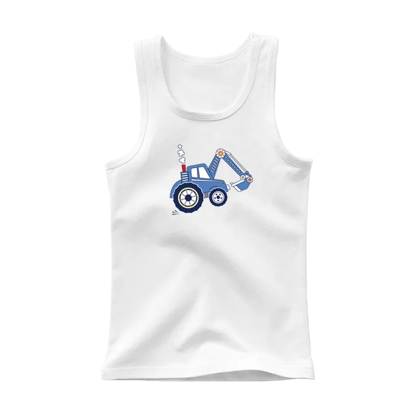 Camisola de algodão infantil com estampado de trator Top de verão para rapazes e raparigas Camiseta de uma cor sem mangas com decote em O