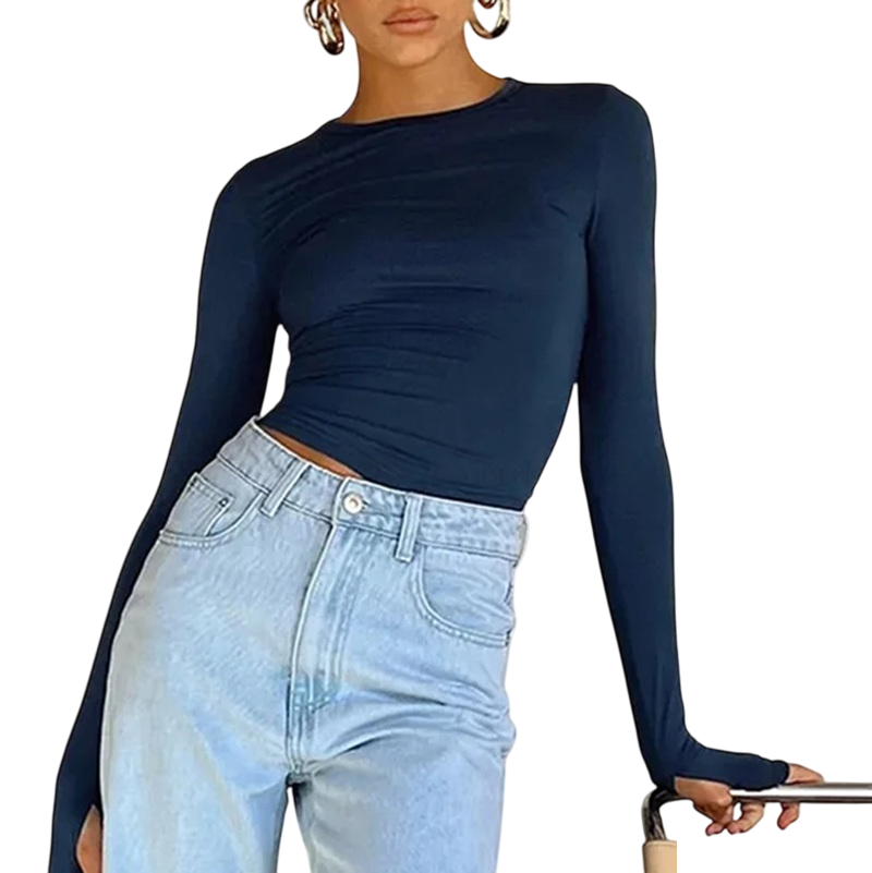 Camisola justa de manga longa e comprimento mais curto até à cintura é ideal para mulheres que procuram um top estiloso e confortável para o dia-a-dia. Descrição completa