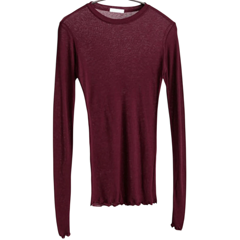 Camisola confortável e ajustada com mangas longas e decote redondo, adequada para uso diário, sobreposições ou estilo casual elegante. Descrição completa