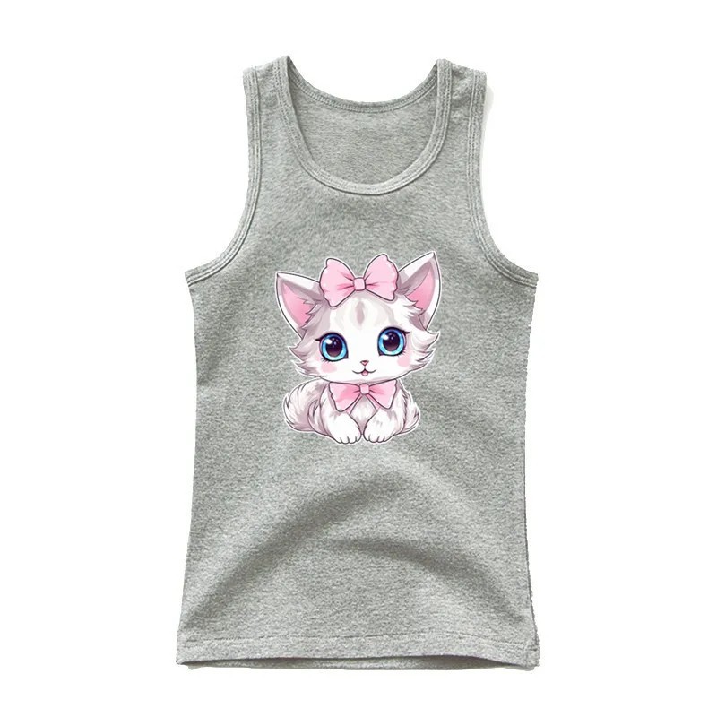Camisola de Verão para Meninas Sem Mangas 100% Algodão Camiseta Lisa com Gato Desenhado Top Princesa Adorável para Crianças Confortável em Várias Cores