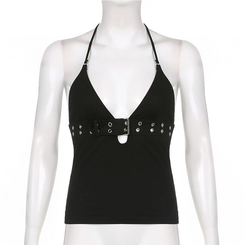 Camisola preta feminina com alças finas Decote em V Cinta sob o peito Top elegante de poliéster e spandex