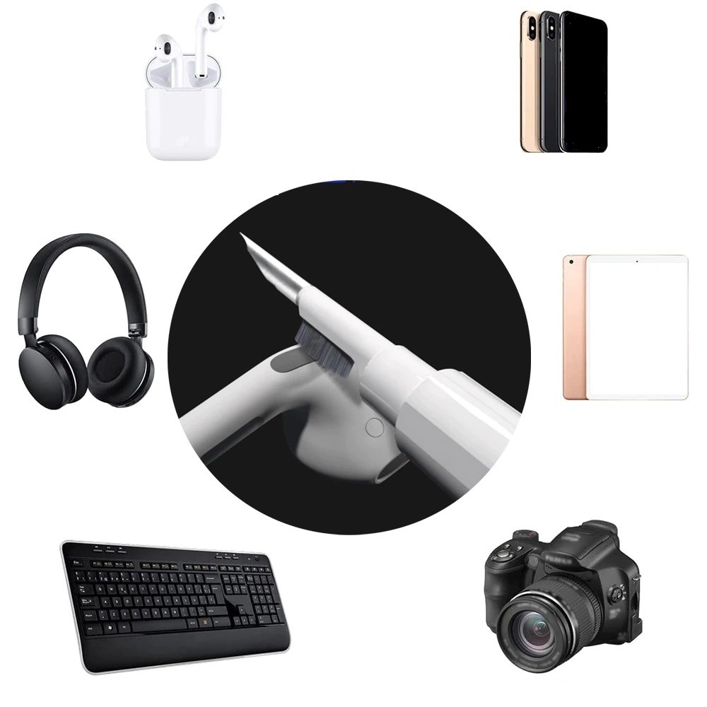 A caneta de limpeza consegue limpar tudo, desde pequenos orifícios até à caixa de carregamento. A ponta da caneta é uma extremidade metálica, que permite limpar pequenas partes e orifícios dos auscultadores. Debaixo da ponta da caneta, há um pincel suave de microfibra, que pode ser utilizado para limpar facilmente a grelha de som dos auscultadores. A outra extremidade da caneta é uma cabeça esponjosa suave, que consegue limpar o espaço de carregamento dos seus auscultadores. Fabricada em plástico de alta qualidade. Não danifica as partes e os orifícios dos auscultadores.