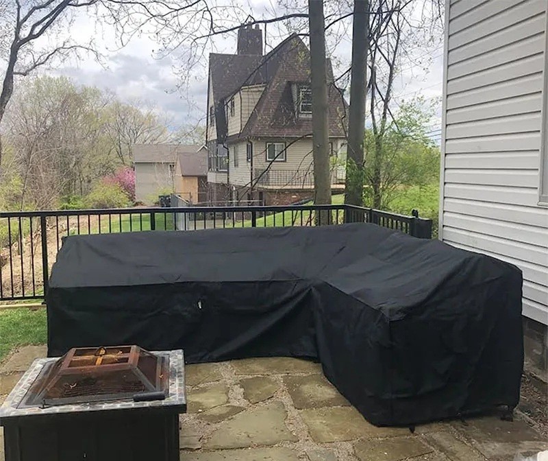 Capa resistente para conjunto de sofá de jardim em forma de L, que protege os móveis da chuva, sol, poeira e vento. Fácil de fixar e manter. Descrição completa