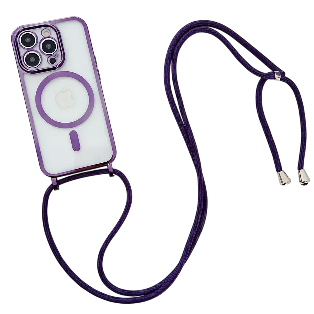 Capa prática para o uso diário do telemóvel com proteção traseira e laterais, fixação magnética e cordão confortável para o pescoço. Descrição completa