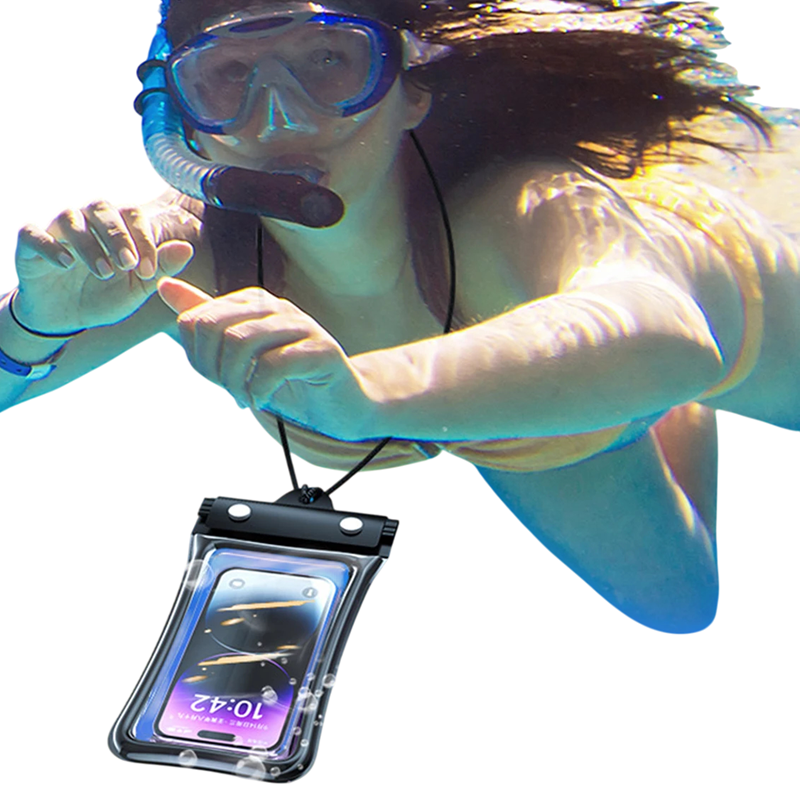 Esta capa flutuante transparente à prova de água é a escolha perfeita para todos que desejam proteger o seu telemóvel durante atividades aquáticas, ao ar livre ou extremas. Graças ao material PVC de alta qualidade, garante proteção fiável do telemóvel contra água, poeira, neve e lama. A janela transparente proporciona visão total e permite fotografar em Full HD, mesmo debaixo de água. A capa é compatível com todos os smartphones com diagonal até 7,5" e permite um controlo confortável a partir do lado. Inclui um prático cordão e uma construção antiderrapante, que assegura um transporte seguro e uma pegada fiável.