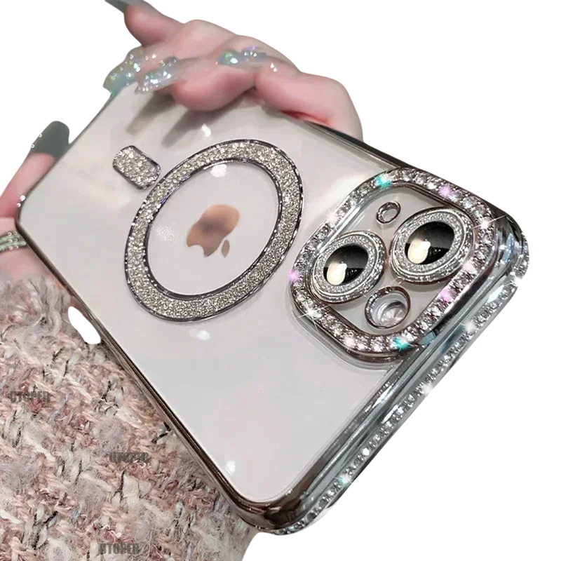 Capa de proteção estilosa com pedrinhas brilhantes, fixação magnética e suporte para carregamento sem fios para iPhone 16 Pro Max. Elegante e prática. Descrição completa