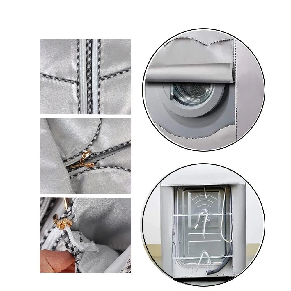 O tecido de poliéster resistente com acabamento prateado cria uma barreira à prova de água e à prova de pó, que protege o aparelho contra gotas de água, vapor e pó do ambiente. A parte frontal é desenhada como uma aba enrolável, que pode ser facilmente levantada e fixada, permitindo o acesso total à porta da máquina de lavar e ao painel de controlo. Os fechos e costuras são cuidadosamente trabalhados para evitar rasgos, mesmo com uso frequente. A parte traseira da capa é parcialmente aberta e equipada com tiras para fixação, permitindo espaço para a ligação de mangueiras e cabos, ao mesmo tempo que permite uma melhor ventilação da máquina de lavar.