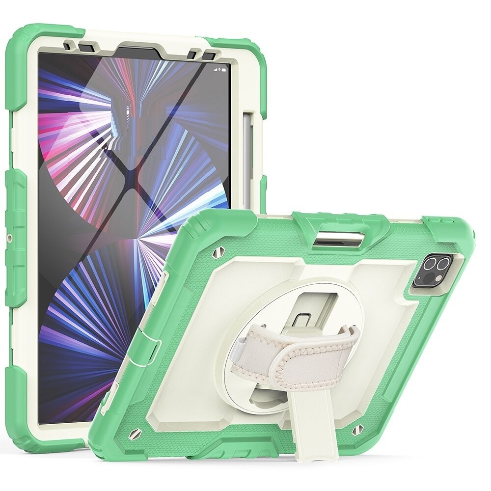 Está à procura de uma capa que proteja adequadamente o seu iPad? Esta capa garante a segurança do seu dispositivo. O policarbonato duro interior com o revestimento exterior em silicone macio oferece proteção máxima. A correia para a mão gira 360° e permite visualização de vários ângulos. Correia para a mão ajustável. Na parte de trás existe um espaço para a Apple Pencil.