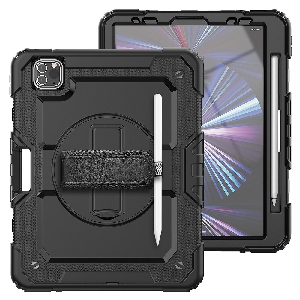 Veja esta capa de qualidade! Ideal para as suas viagens e uso doméstico. Ajusta-se bem ao seu dispositivo. Possui aberturas para conectores. A correia de mão roda 360°. O policarbonato duro interior com revestimento exterior em silicone macio oferece proteção máxima. Correia de mão ajustável. Na parte traseira tem espaço para a Apple Pencil.
