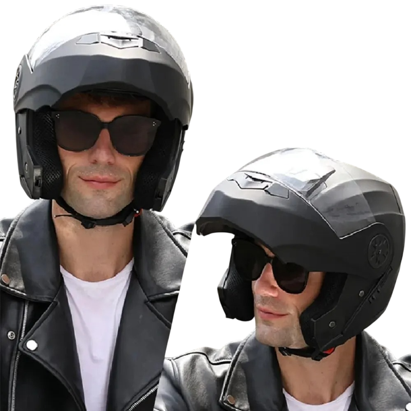 A principal vantagem é o design de viseira dupla, que ajuda a melhorar a visibilidade em condições de luz variáveis e a proteger a visão. A construção integral proporciona cobertura completa da cabeça e do rosto, o que é importante ao conduzir em tráfego urbano e fora dele. O design flip-up permite a abertura rápida da parte frontal do capacete, o que é prático para comunicação ou pausas curtas. A cor preta confere um visual intemporal e não perturba o estilo geral do equipamento. A forma do capacete é projetada para apoiar o campo de visão natural do motociclista.