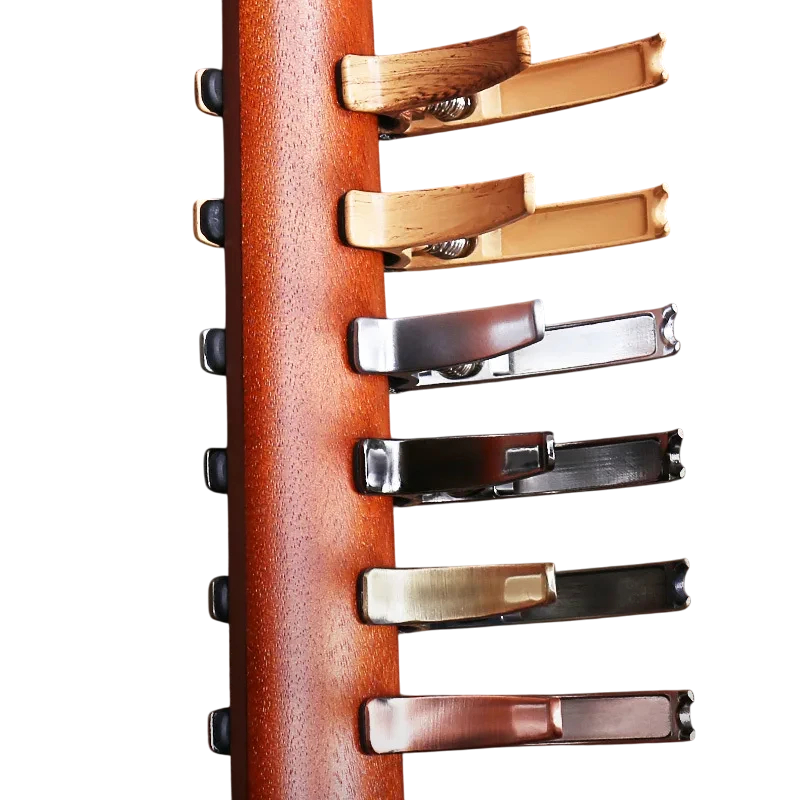 Este capotraste metálico resistente em liga de alumínio é um acessório prático e indispensável para qualquer guitarrista. Permite uma rápida mudança de afinação sem a necessidade de reconfigurar o instrumento. Graças ao mecanismo de mola, pode ser facilmente fixado com uma mão, independentemente de tocar guitarra acústica, elétrica ou clássica. A construção leve em cores neutras combina com qualquer instrumento e não sobrecarrega o braço da guitarra. As superfícies de contacto emborrachadas protegem o braço e as cordas contra riscos.