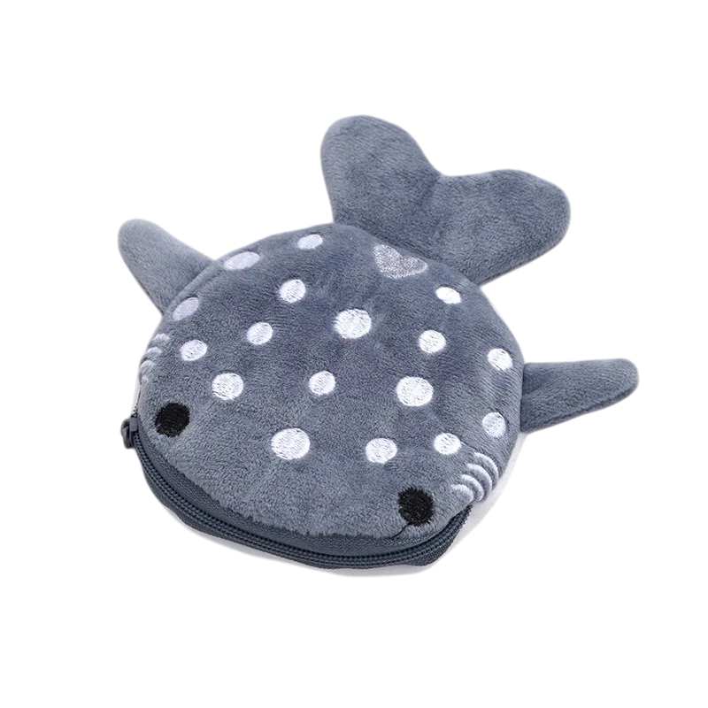 Carteira de peluche suave com um adorável tubarão, adequada para pequenas coisas e cabos. Tamanho prático, fecho e laço para pendurar ou transportar. Descrição completa