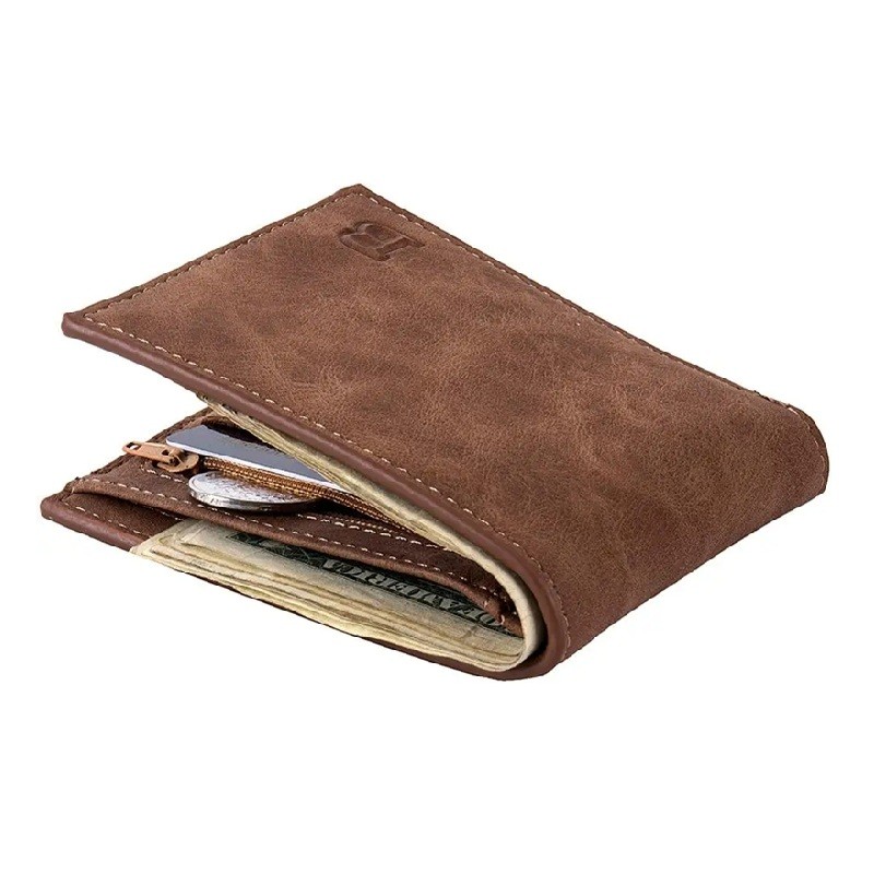 Esta prática e estilosa carteira masculina é ideal para qualquer homem que procura um acessório elegante e compacto. Fabricada em pele PU de qualidade, que é durável e agradável ao toque, oferece design moderno e longa durabilidade. Dimensões de 11 x 8,5 cm permitem fácil transporte no bolso ou na mala, enquanto compartimentos para cartões proporcionam armazenamento organizado dos seus documentos e cartões de pagamento. Bolsa integrada com fecho permite o armazenamento seguro de moedas ou outros pequenos objetos.