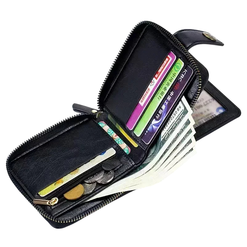 Carteira masculina com fecho de correr em pele PU de qualidade. Dimensões 12 x 9,5 cm, compartimentos para cartões com fecho de pressão, bolso para moedas e design elegante. Descrição completa