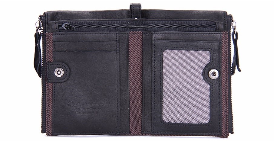 A carteira oferece espaço suficiente para cartões e grandes compartimentos para notas.