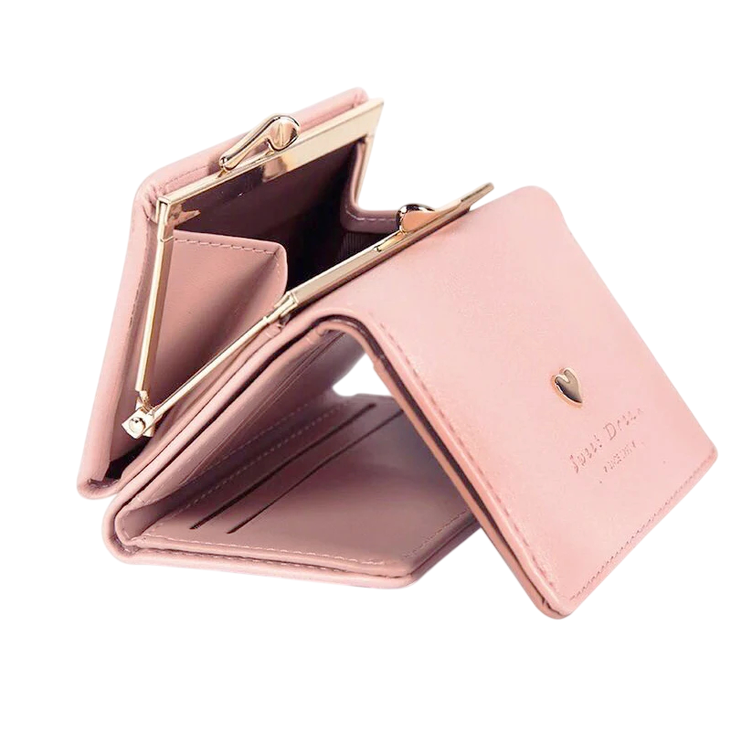 Estilosa mini carteira em pele sintética com solução dobrável, detalhe em forma de coração e bolso com fecho para armazenamento organizado de pequenos objetos Descrição completa