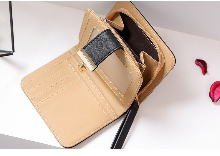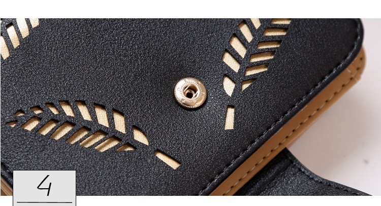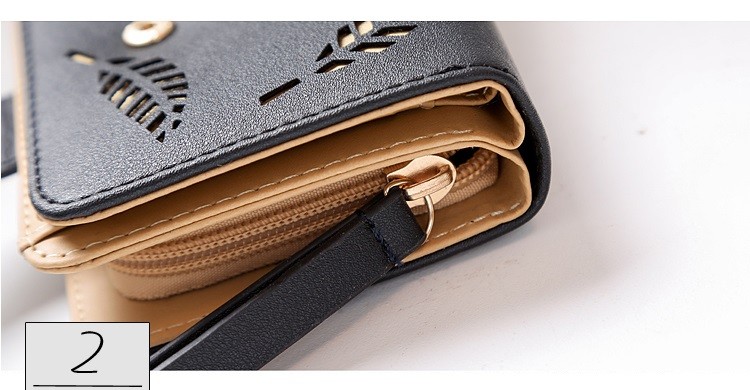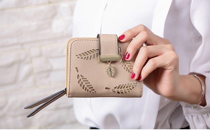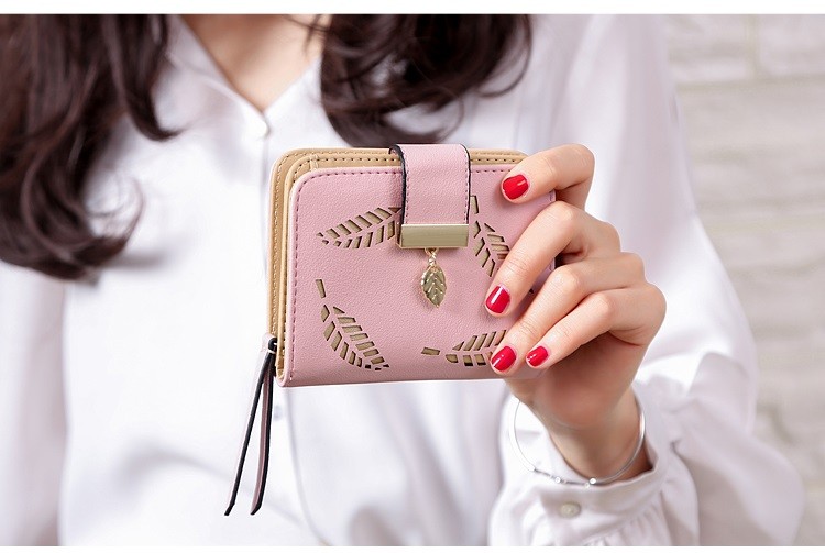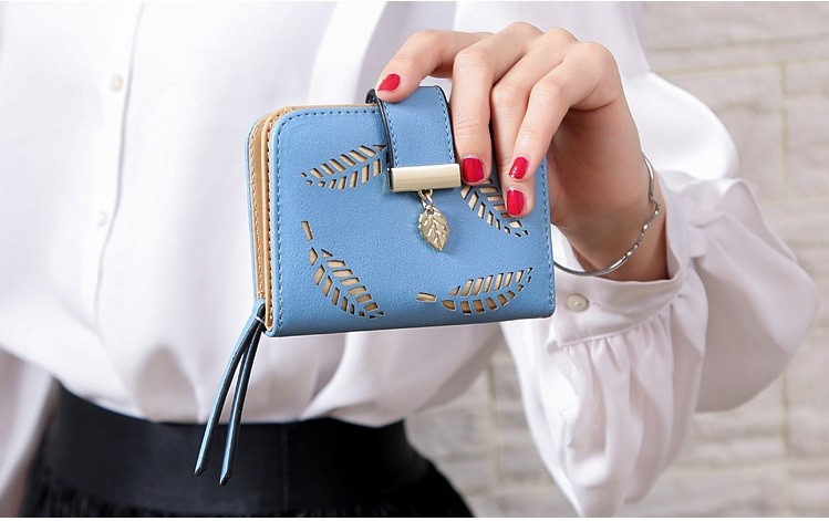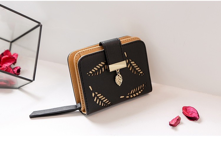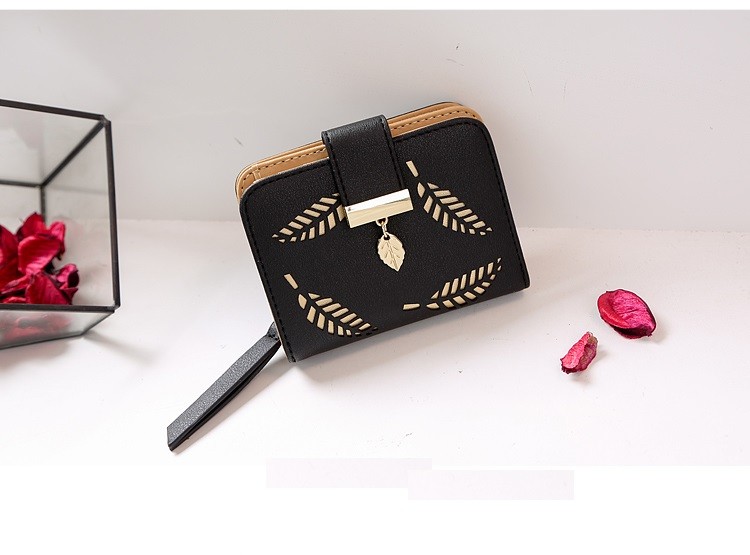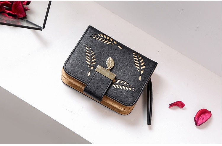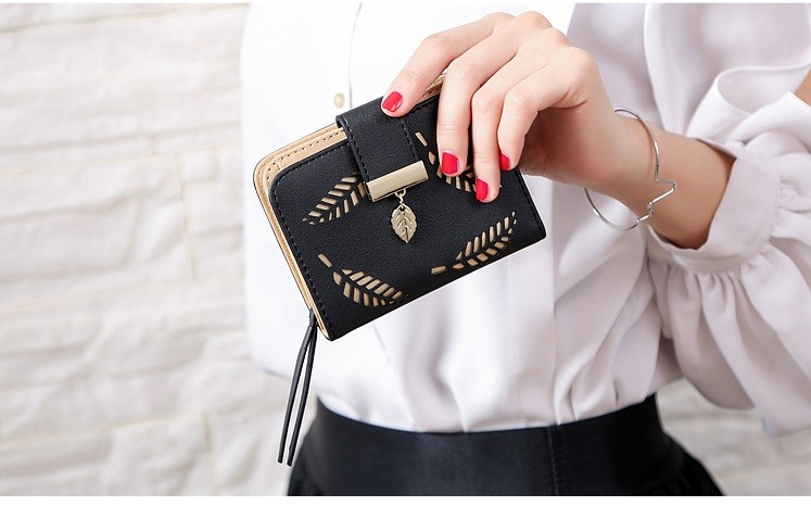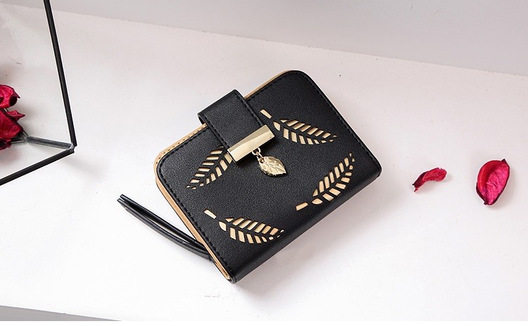 Esta bonita carteira com estampado de folhas e fecho em forma de folha é um acessório feminino prático.