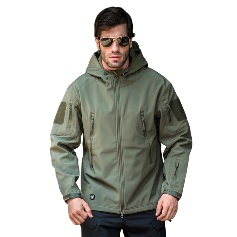 Casaco de softshell para homem resistente, adequada para vento e chuva. Capuz, múltiplos bolsos e conforto para caminhadas, atividades tácticas e uso diário. Descrição completa