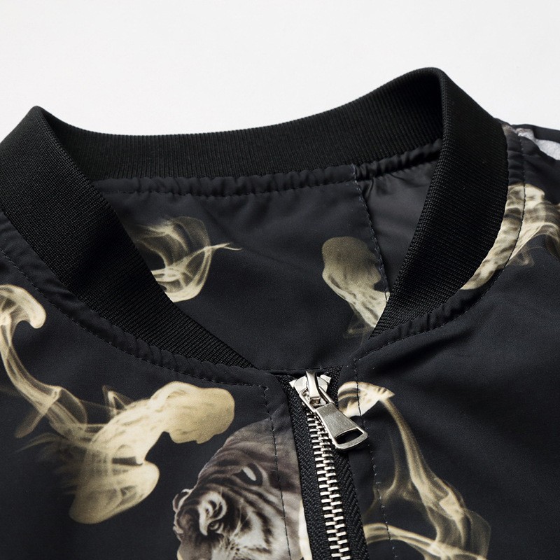 Com este casaco com estampado de caveiras e caricaturas de tigres, você vai parecer incrível.