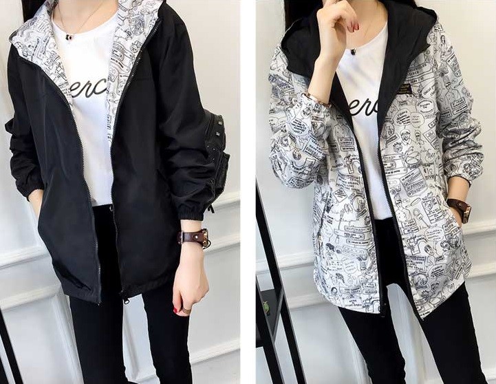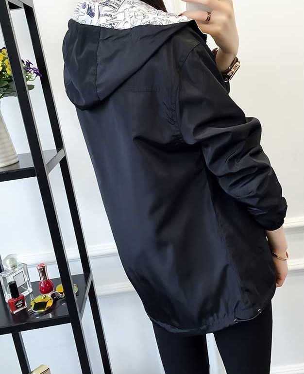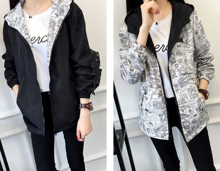 Seja estilosa com este casaco reversível, o casaco é colorido de um lado e quando o vira tem uma estampa de banda desenhada.