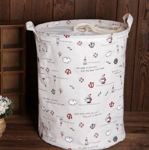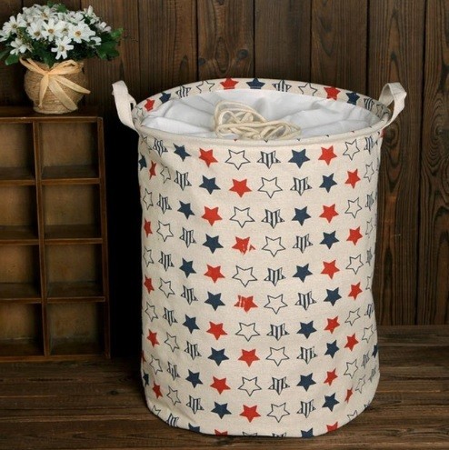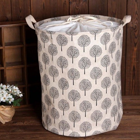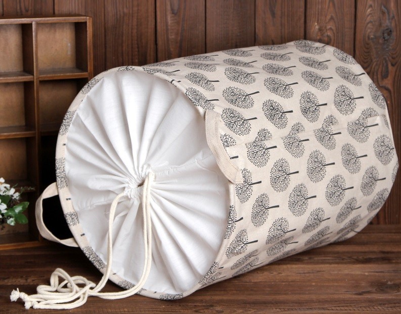 A tampa do cesto é feita de tecido ao longo do cilindro, com um cordão para aperto e fecho.