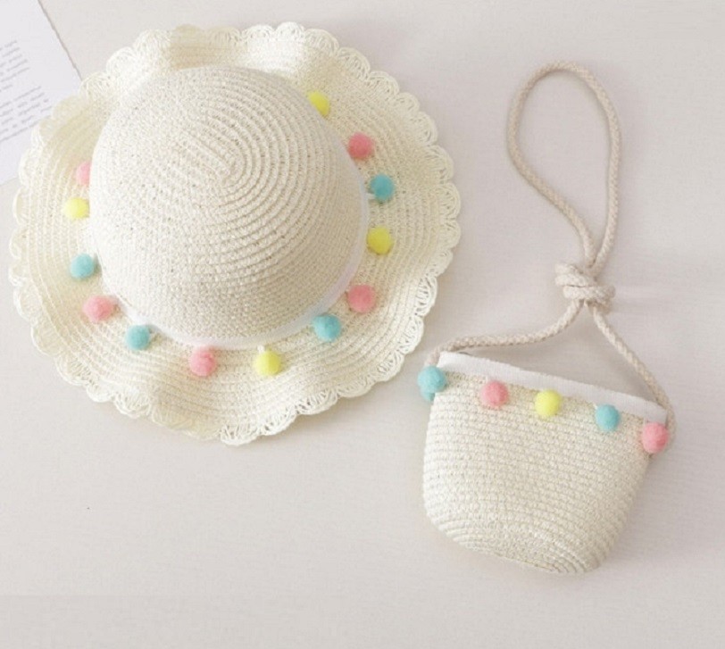 Bonito conjunto de verão para menina - chapéu de palha com pompons e mala no mesmo design.