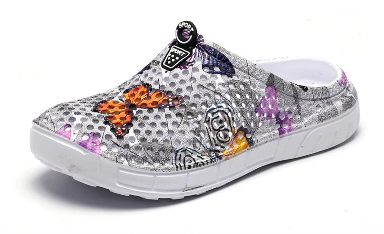 Estes chinelos de borracha com estampado de borboletas são uma excelente escolha para os dias de verão.