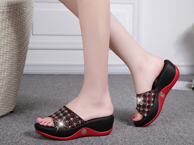 Os chinelos têm plataforma, tornando-os muito confortáveis.