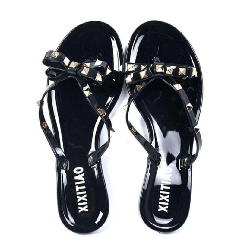 Os chinelos são adornados com um laço com tachas.