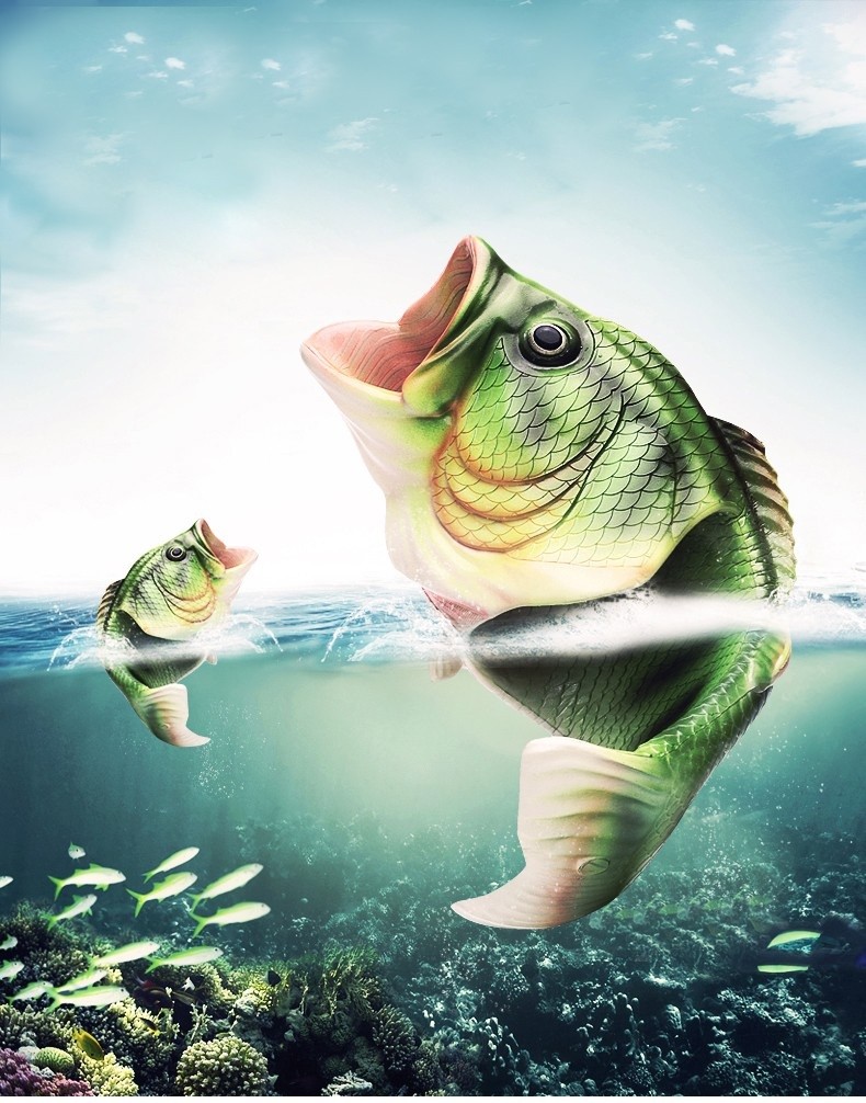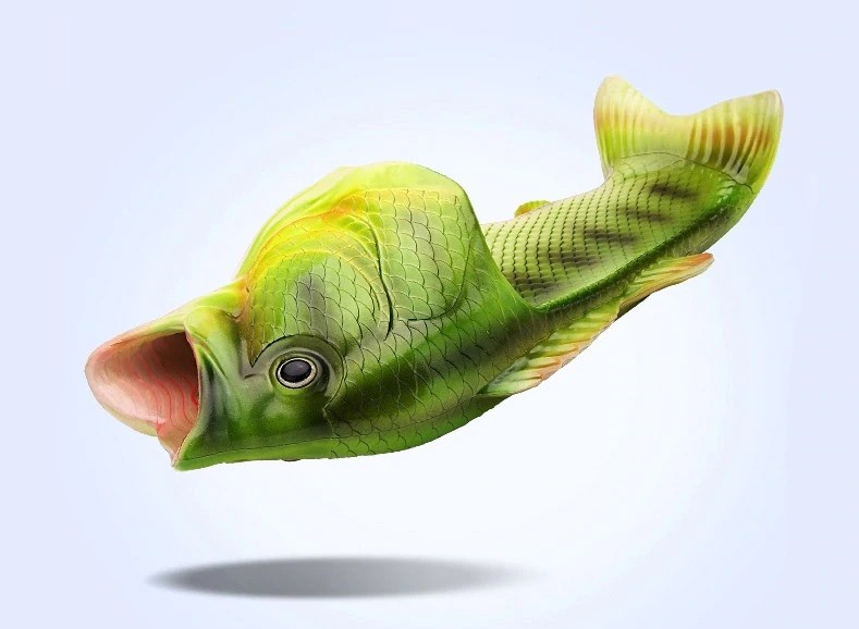 Estes chinelos de borracha em forma de peixe farão as delícias de todos os pescadores.