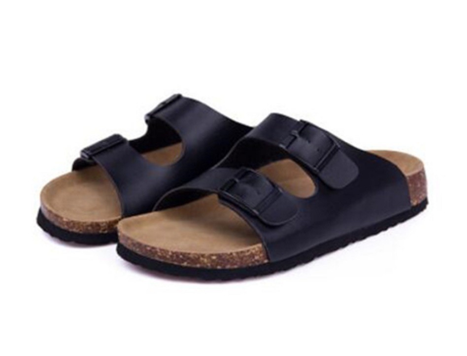 Estes chinelos de cortiça têm uma palmilha anatomicamente moldada, sola antiderrapante e fecho com tiras.