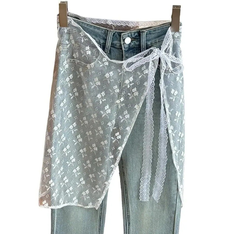 Cinto de Tule Branco com Renda 74 x 55 cm Saia Transparente com Flores Sobreposição Elegante sobre Calças Acessório Decorativo em Camadas